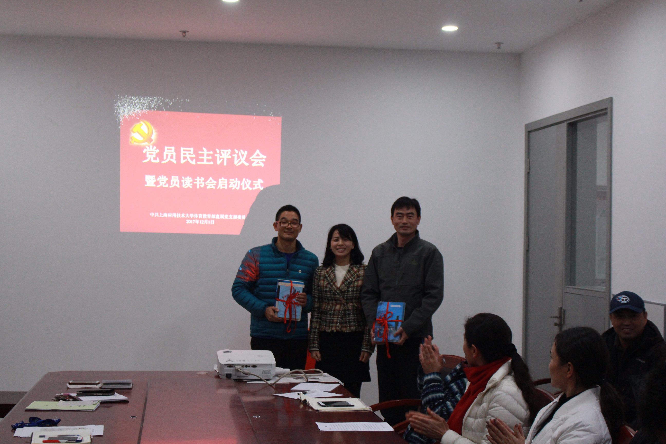 12月1日周五下午,体育教育直属党支部在体育馆A110会议室举行了“党员读书会”启动仪式。首先党总支宣传委员任卫红老师宣读了党支部对全体党员发出的倡议。直属党支部书记韩磊分别向两个党小组赠送书籍:直属党支部根据学校校报的“名师荐书”栏目,购买了第一批书籍。如:《习近平的七年知青岁月》、《本杰明 富兰克林自传》、《思考快与慢》、《活出生命的意义》等6本优秀图书。计划采取“图书漂流”的方式在党小组中开展学习,期待党员在小组互相监督下逐步养成爱读书、多读书、读好书的习惯。努力提高自身的思想水平、政治觉悟、道德品质、文化素养,努力成为德才兼备、全面发展的人才。进而不断推动学习型党组织的建设,力争在工作中充分发挥党员的先锋模范作用和党组织的战斗堡垒作用。