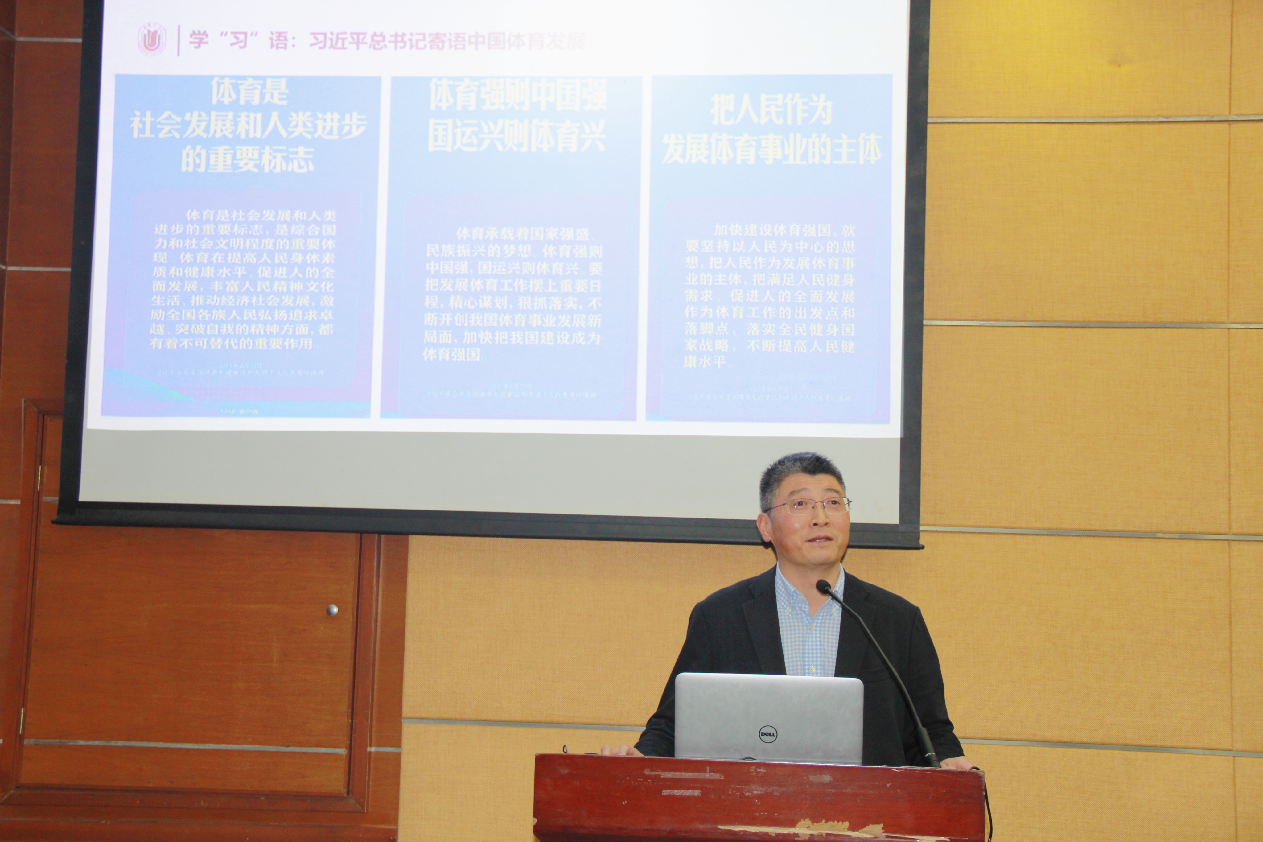 近日,由党委教师工作部主办、体育教育部承办的学校第80期教师沙龙在校举行,沙龙邀请上海大学体育学院院长刘兵教授来校作学术报告。体教部主任尹小俭、体教部直属党支部书记韩磊出席活动,教师代表和大学生体育协会骨干代表等百余人参加活动。