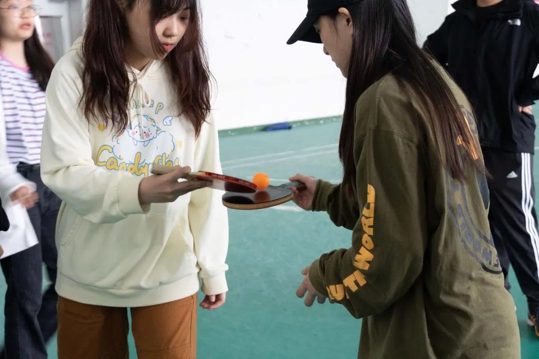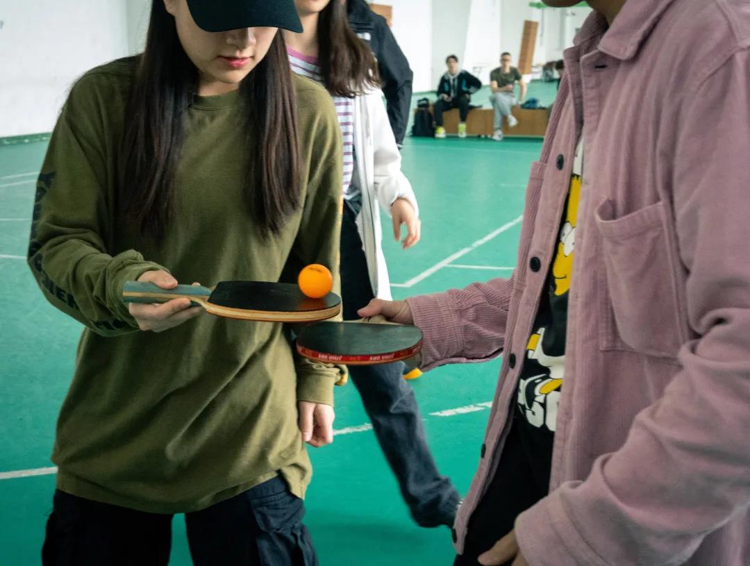 团队作战环节刚刚开始,就迎来了重头戏“传递乒乓球”7名队员横排站好,从指定地点拿着乒乓球拍相互传递到最后一名队员,最后一名同学要将乒乓球拍上的乒乓球放进最后地上的纸杯。另两名队员要互相拍打乒乓球共计十下。成功后所有队员要将红绳互相绑在脚上,两人三足一起达到终点线,用时最短者获胜。