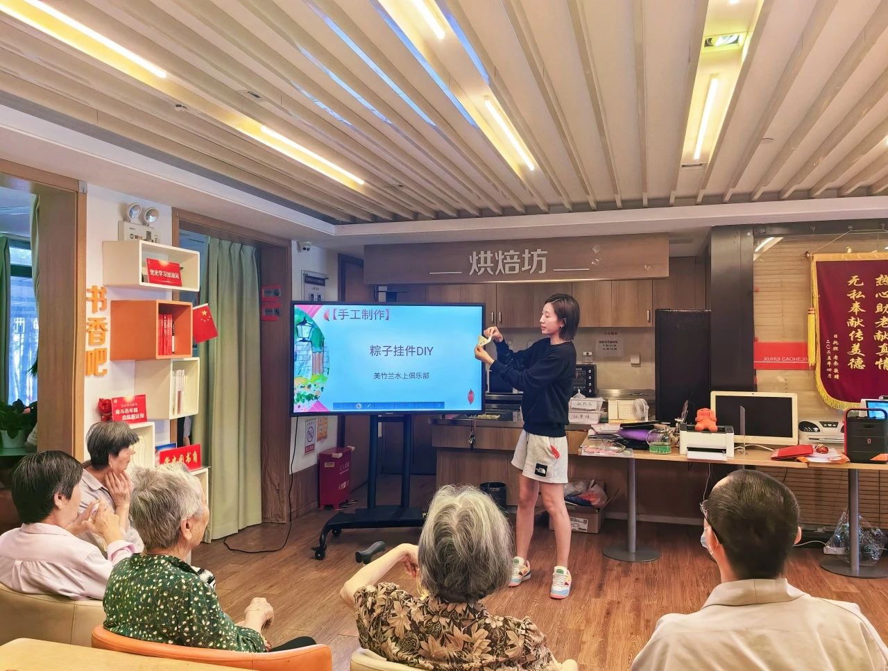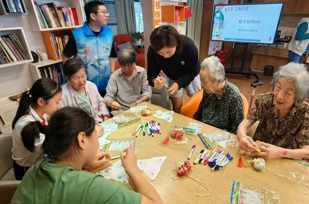 在表演结束后,长者们还参与了端午节纸盘诗词贴画和龙舟手工DIY模型制作等活动,这些创意无限的手工活动让长者们体验到了传统文化的乐趣,也促进了长者与志愿者的交流与情感连接。年轻志愿者们手把手地指导,老人们饶有兴致地尝试,指尖传递的不仅是技艺,更是温暖的关怀与陪伴,让传统节日充满了浓浓的人情味。