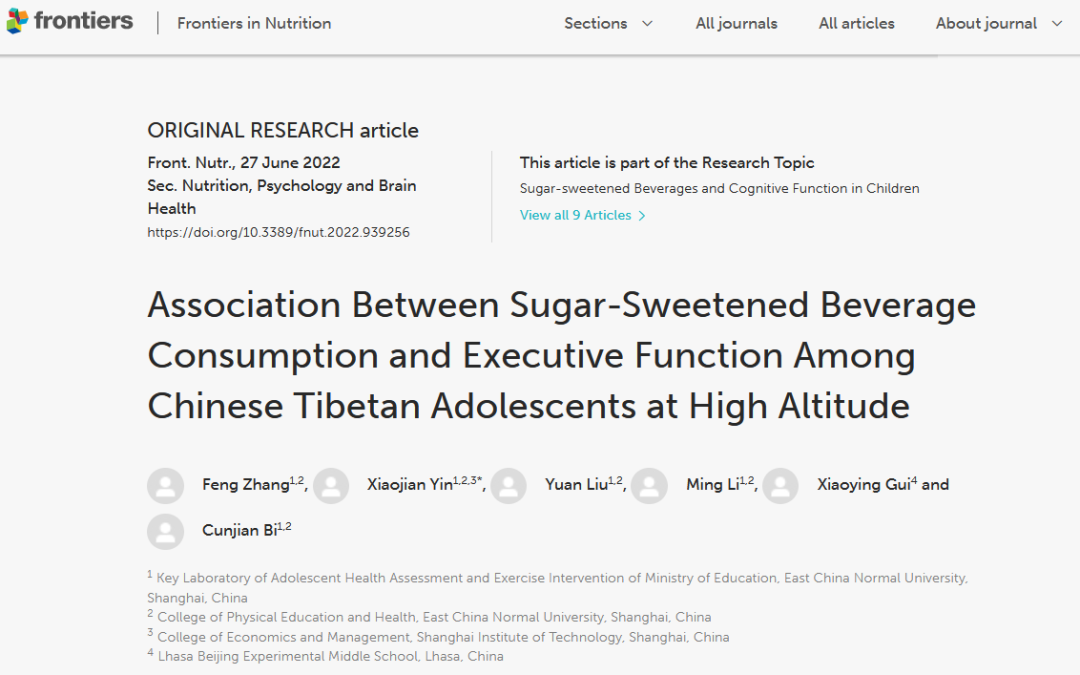 近日,著名期刊Frontiers in NutritionSCIE,影响因子6.590,中科院一区)报道我校体育教育部尹小俭教授团队在中国藏族青少年含糖饮料消耗与执行功能的关联研究方面取得的最新研究成果。论文于2022627日以题目“Association Between Sugar-Sweetened Beverage Consumption and Executive Function Among Chinese Tibetan Adolescents at High Altitude”发表在该期刊上。该成果为尹小俭教授主持我校2020年上海哲学社会科学规划课题(2020BTY001)阶段性研究成果。