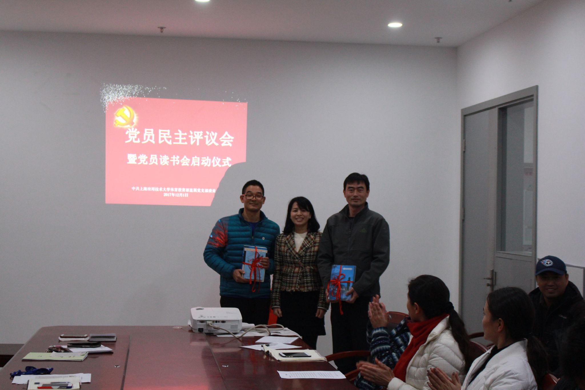 121日周五下午,体育教育直属党支部在体育馆A110会议室举行了“党员读书会”启动仪式。首先党总支宣传委员任卫红老师宣读了党支部对全体党员发出的倡议。直属党支部书记韩磊分别向两个党小组赠送书籍:直属党支部根据学校校报的“名师荐书”栏目,购买了第一批书籍。如:《习近平的七年知青岁月》、《本杰明 富兰克林自传》、《思考快与慢》、《活出生命的意义》6本优秀图书。计划采取“图书漂流”的方式在党小组中开展学习,期待党员在小组互相监督下逐步养成爱读书、多读书、读好书的习惯。努力提高自身的思想水平、政治觉悟、道德品质、文化素养,努力成为德才兼备、全面发展的人才。进而不断推动学习型党组织的建设,力争在工作中充分发挥党员的先锋模范作用和党组织的战斗堡垒作用。