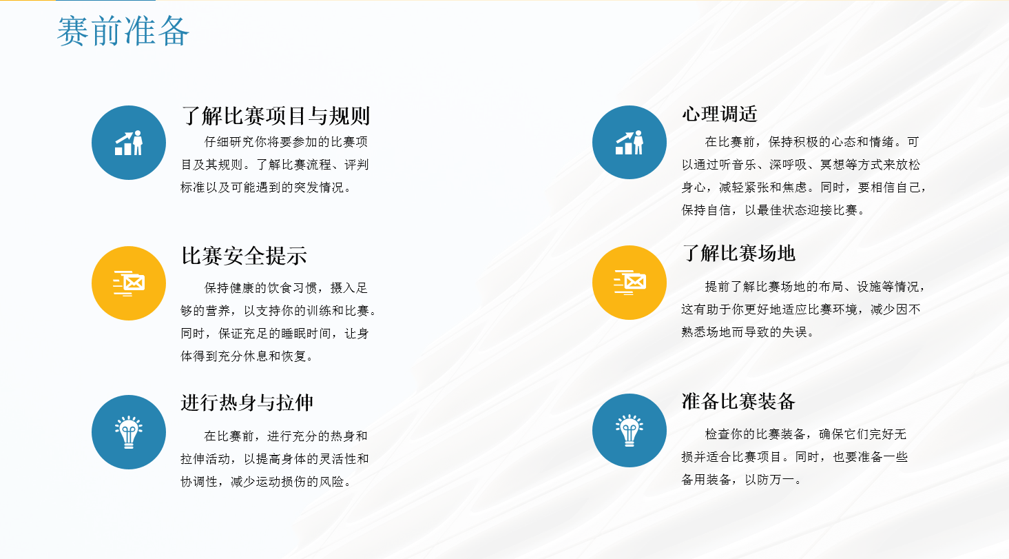 会上,郑冬华、余迅老师分别详细讲解了运动会各个环节的安全注意事项。在赛前准备方面,强调运动员要做好充分的热身运动,检查自身装备的安全性等,确保以良好的身体状态投入到比赛中。对于比赛过程中的安全,老师着重指出运动员要严格遵守比赛规则,避免因违规行为导致意外发生。并且要时刻关注自己的身体状况,一旦出现不适,应立即停止比赛并寻求医疗帮助。赛后,老师提醒运动员不能马上放松,应进行适当的放松活动,避免肌肉损伤。同时要及时补充水分和营养,促进身体恢复。此外,培训会还强调了观众文明观赛的重要性。观众们应遵守赛场秩序,不大声喧哗,不干扰比赛,为运动员们创造一个良好的比赛氛围。