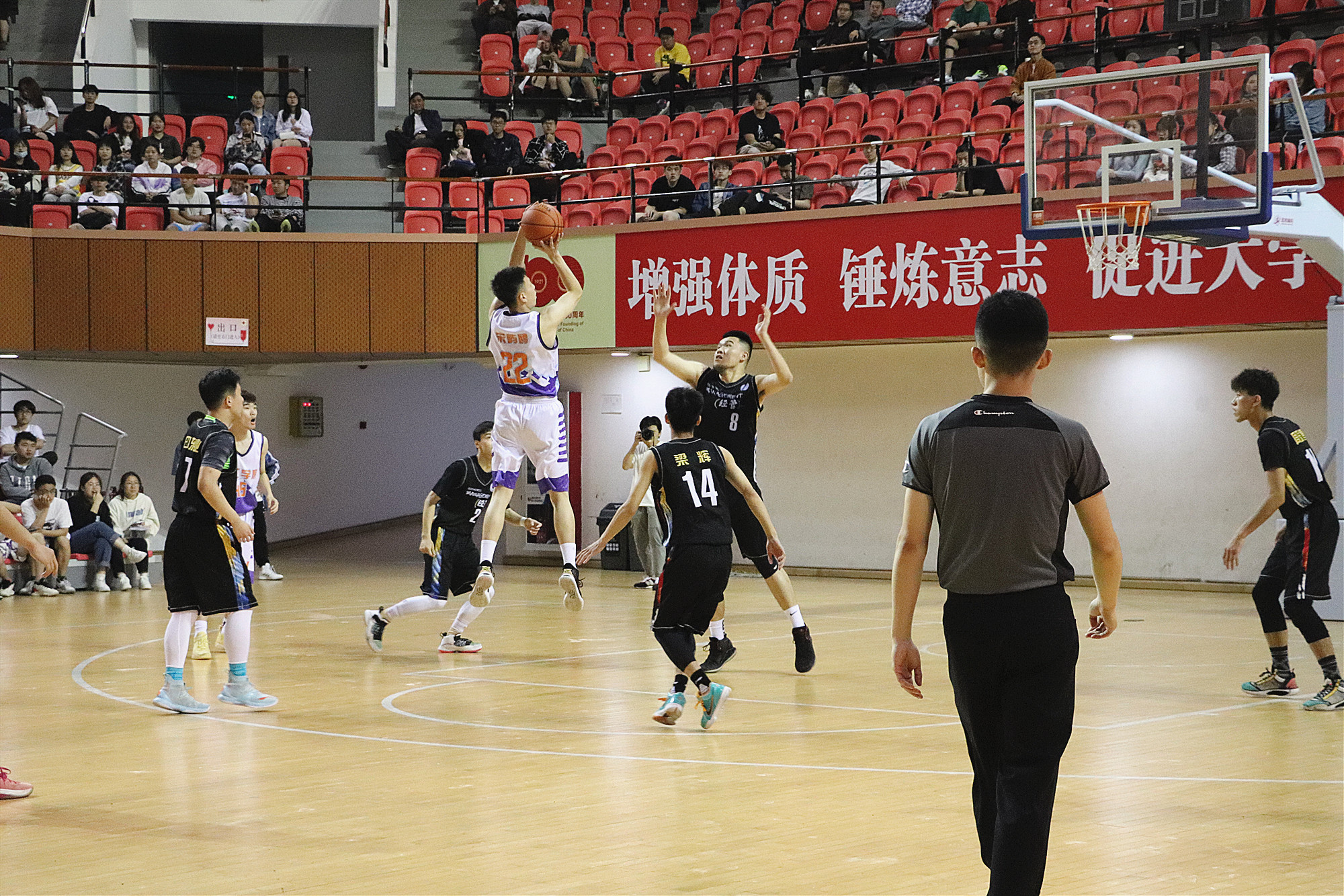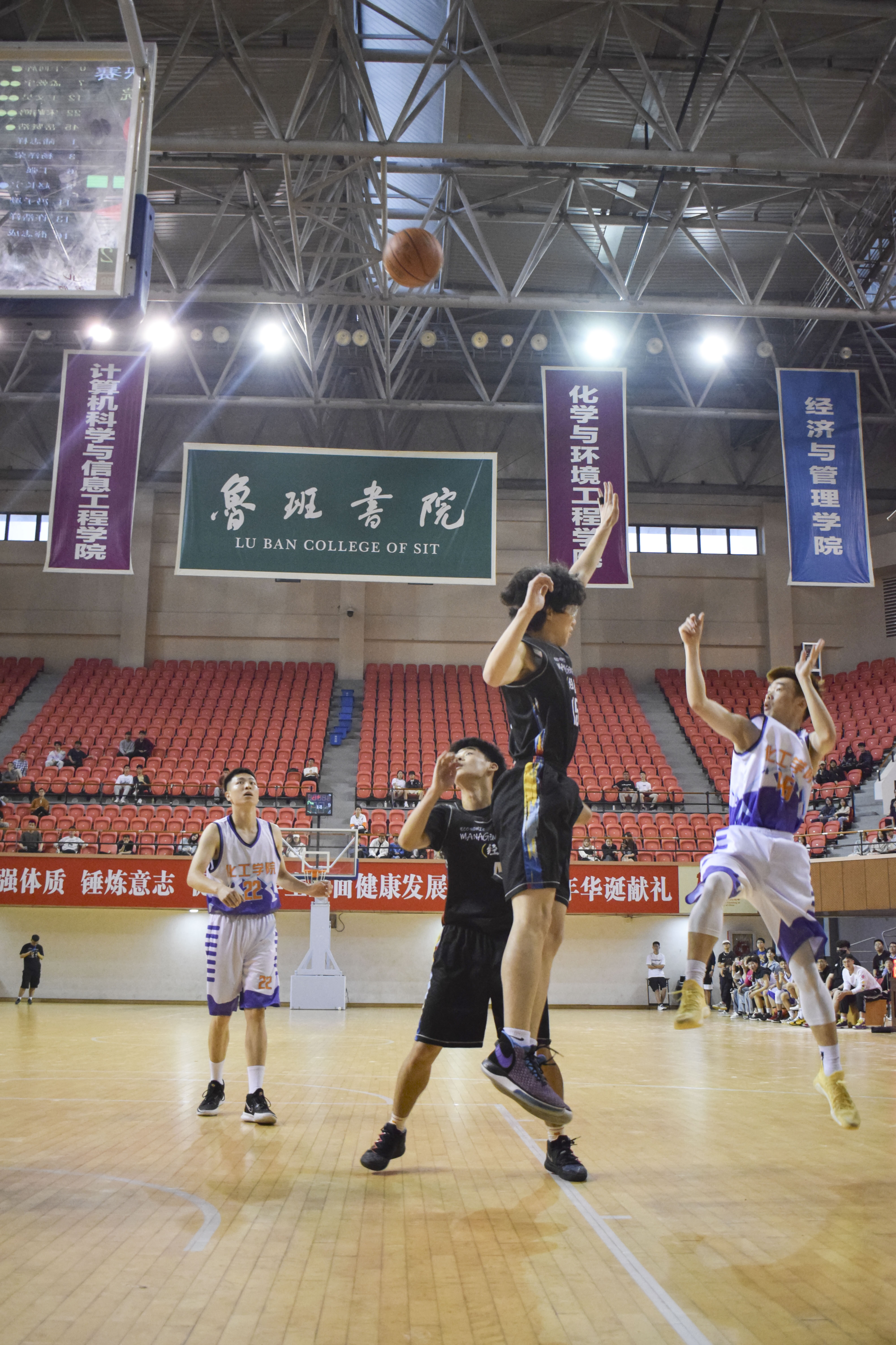5月20日晚近千名学生注视国旗,在庄严肃穆的国歌声奏唱礼毕后一场精彩绝伦的决赛正式开场,学生啦啦队加油助威的呐喊声不时响彻全场。最终,经过激烈的角逐,化工学院以68:62夺得本届篮球赛冠军经管学院获亚军城建学院获季军、工创学院获第四名。党委学工部部长、学生处处长袁翔、化工学院、经管学院、体教部等部门主要负责人观看整场比赛并为获奖队伍颁奖。体教部其他教练、学院教师代表为决赛队伍加油鼓劲。此次决赛裁判员由我校电气学院毕业的校友,以及特邀了上海师范大学和海事大学的国家级裁判员共同组成。主办方对裁判组的精心设计也保证了本次比赛的公平和公正。